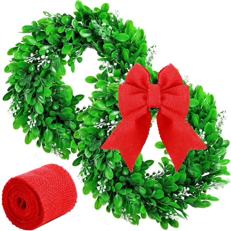 WILLBOND 2 Pcs Boxwood Wreath 11.8 Inch Artificial Christmas Wreath Outdoor Wreath Green Leaves Wreath with 16 Feet Sackcloth for Xmas Decor Front Door Wall Window Wedding(Red Sackcloth)