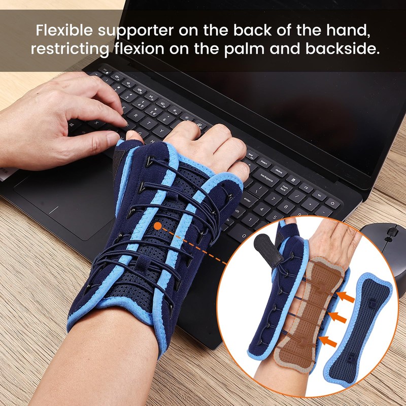 - 【True Stabilization of Your Wrist】Willcom Wrist Brace with Thumb Stabilizer with its true stabilization for your wrist. Unlike other braces, it features a breathable, flexible support plate on the back of the hand that effectively prevents reverse bending of the wrist. Additionally, two spoon-shaped aluminum palm rests on the palm side, along with flexible plastic bars on the back of the hand, work in harmony to securely hold your wrist in place, providing optimal support and stability.