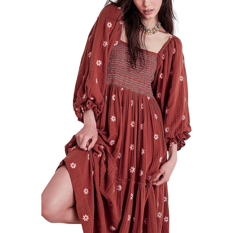 Willow Dance Women Casual Bohemian Floral Dress Square Neck Ruffle Swing A Line Dress Long Sleeve Beach Maxi Dress (Brown, Large)
