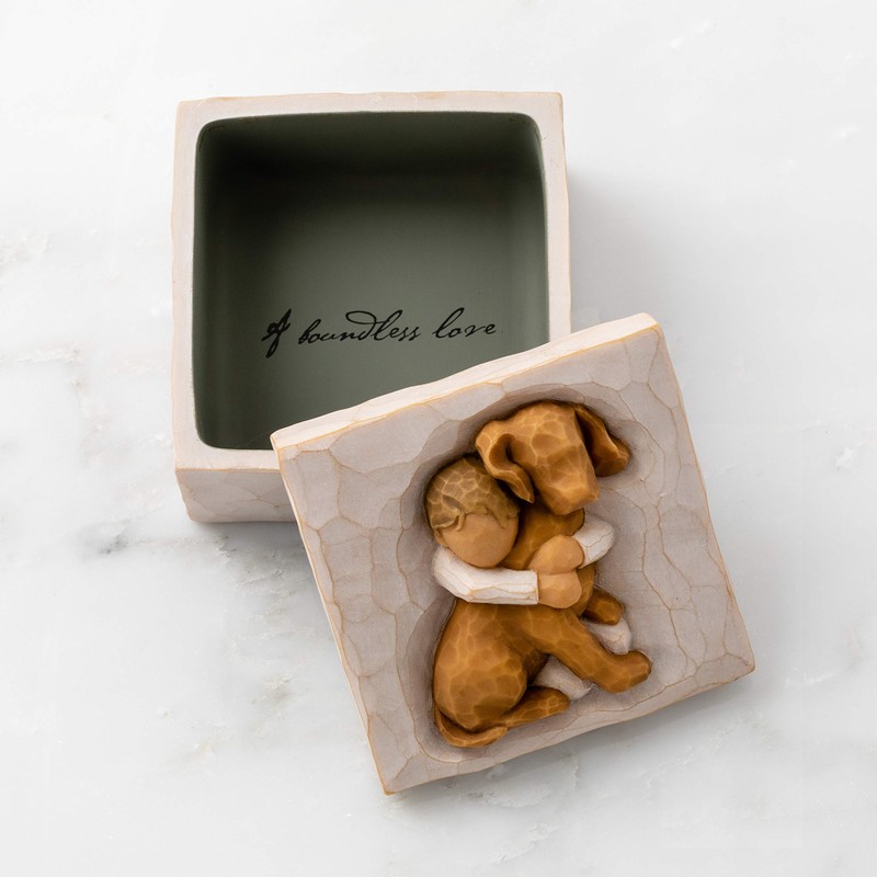 - Small carved Keepsake Box features a small boy hugging a very large dog (dog has golden fur). A gift of friendship for pet owners and pet lovers; a gift of comfort and support for someone who has lost a beloved pet. Inside, the bottom of box reveals a message of comfort and love as a hidden discovery. Packaged in fitted box ready for gift-giving.