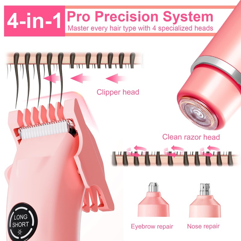 - 🔍 4-in-1 Pro Precision System: Master every hair type with 4 specialized heads: Body Shaver: Silky-smooth legs/arms in seconds, Long Hair Trimmer: Safe sculpting for bikini & underarms, Rotary Head: Erases peach fuzz + facial stray hairs, No more blind spots – even in delicate curves.