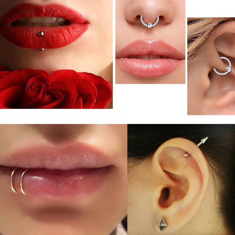 - Body Piercing Jewelries Set:4pcs belly button ring-14G=1.6mm, 8pcs eyebrow ring-16G=1.2mm;4pcs 16G cartilage earrings, 8pcs 16G lip ring, 4pcs 14G industrial barbell 38mm, 8pcs 16G horseshoes rings, 4pcs 16G captive rings,8pcs barbell for nipple rings and tongue rings; 6pcs 18G nose studs,3pcs of C-shape rings and open nose rings, size;1.2*8/10/12mm;Ball Replacement:5pcs of each ball and spike.
