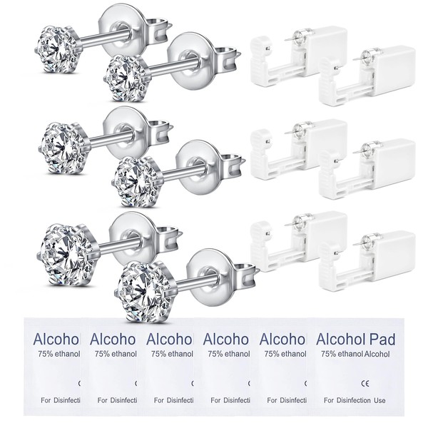 - Ear Piercing Kit: Each package contains 6 pack ear piercing gun, 6pcs silver cubic zirconia stud earrings (Built-in the ear pierce gun) with 6 cleaning cotton pads.
