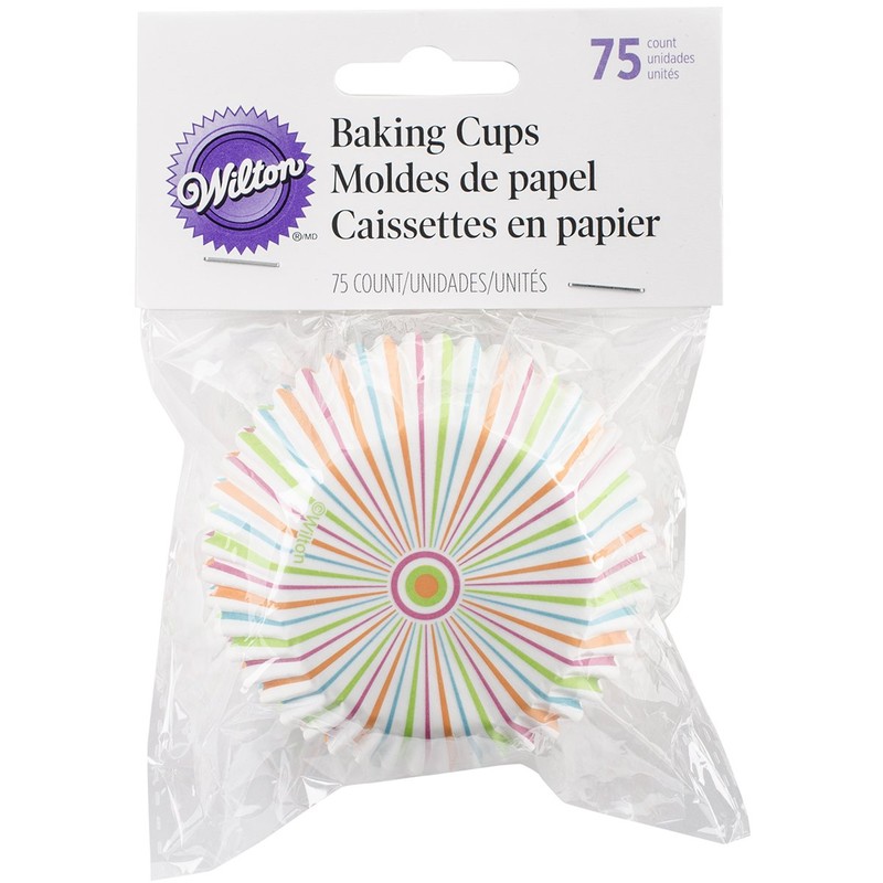 - Bake beautiful and bright cupcakes or muffins using these multi-coloured stripe baking cups. The fun multi-colour pattern features a small circle pattern at the centre with vertical stripes radiating out towards the top of the cupcake liner. Pack of 75 baking cups.