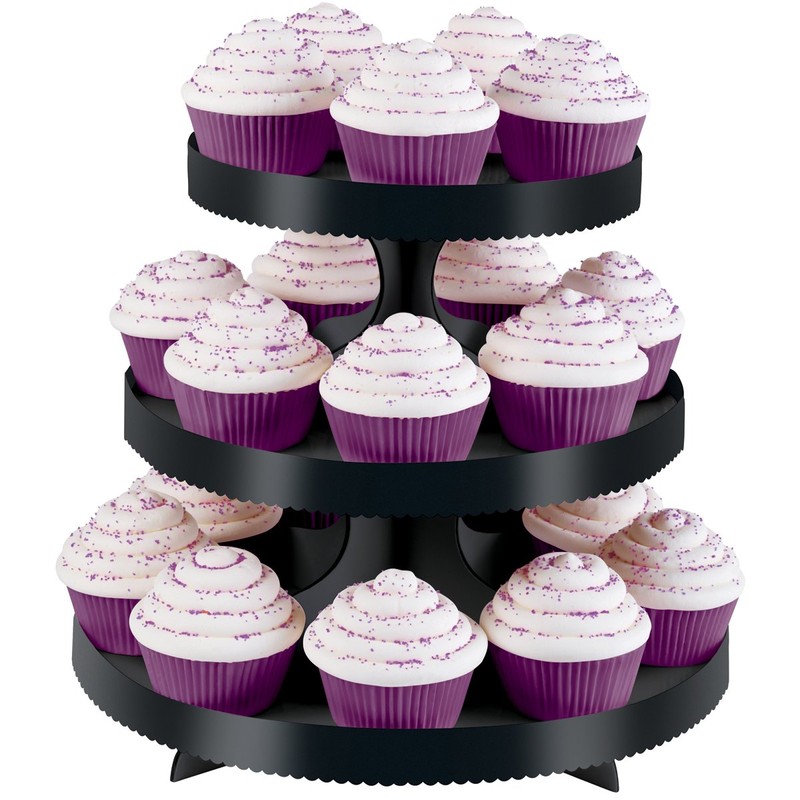 Your cupcakes will look perfect for the party displayed on this 3-tier cupcake stand. Includes decorative 1" borders that wrap around each tier. Holds up to 24 cupcakes. Simple assembly instructions included.