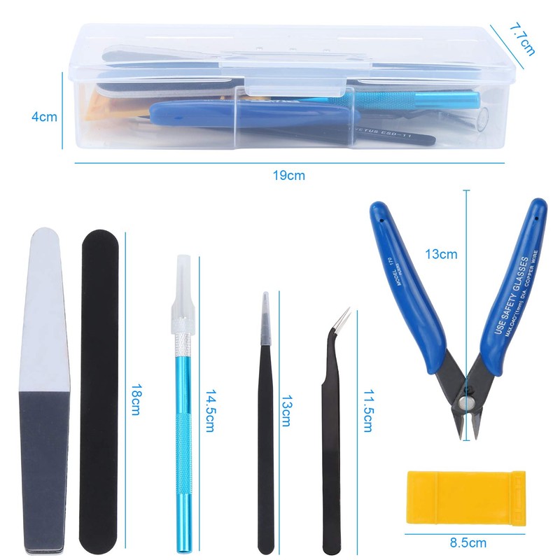 - ✔️ The package includes: 1 x diagonal pliers, 2 x tweezers, 1 x model separator, 2 x double-sided polished rod, 1 x pen knife, 1 x 5 pieces replacement blade, 1 x transparent box.