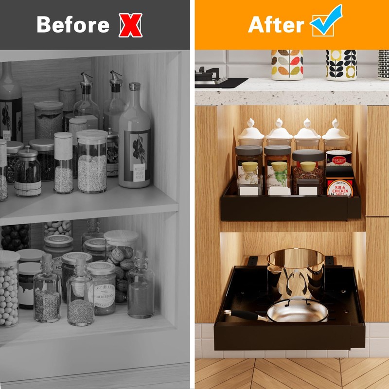 • 【Our Commitment to Your Satisfaction】Organizing your cabinet space just got easier with the slide out cabinet organizer.We pursue the best customer service experience. If you have any questions before purchasing or after receiving the product, please feel free to contact us.Your trust means everything to us, and we are dedicated to ensuring that our pull out cabinet organizer perfectly aligns with and fulfills your unique needs.