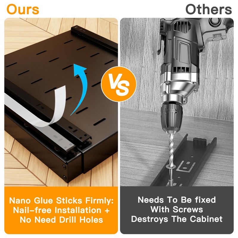 - 【No Need Drill & Nail】Our pull out expandable cabinet organizer is very easy to install, no drilling or screwing required and just following manual.It comes with 3 strips of 3M adhesive tape and can be installed directly with the tapePerfect for your kitchen, bathroom, under sink and pantry storage organizing.