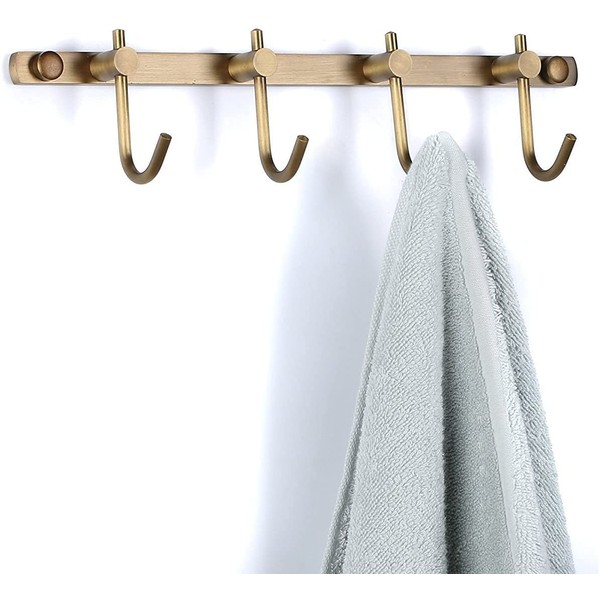 WINCASE Brass Towel Hook Rack, Brushed Brass Wall Hook Rack, Antique Brass Row Hooks with 4 Hooks Rustic Wall Mounted
