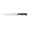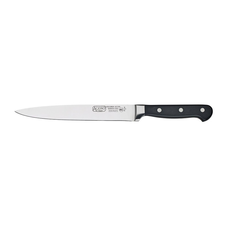 High carbon German steel, Unique solid POM handle helps with weight distribution, Triple rivet handle, 8-inch full tang steel blade, Dishwasher safe.
