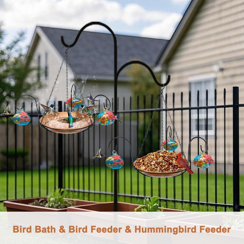 - Easy to assemble & hang: Simply fill the metal bowl with water or wild bird seed,then hang it outdoors to attract birds to enjoy.Including a bird bath bowl (11 inches),3 glass hummingbird feeders,a metal hanger with 3 hanging chains