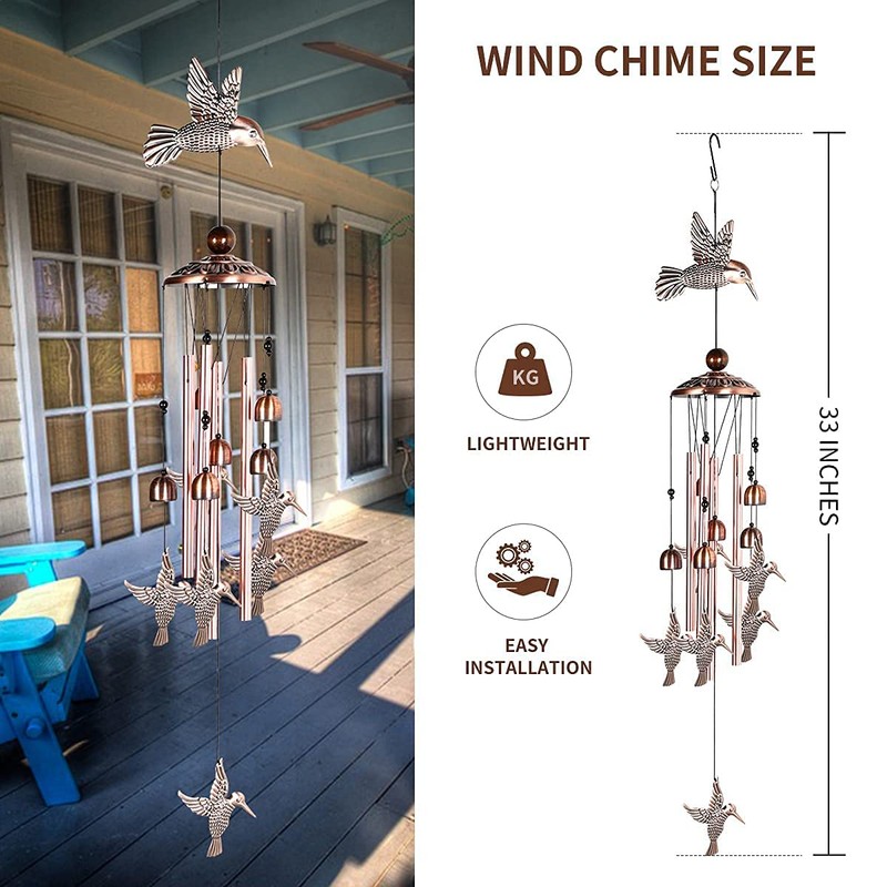 - 【Unique design】The length of the wind chime is about 31 inches. Each wind chime is decorated with 1 big hummingbird and 6 little hummingbirds. There are 4 hollow aluminum tubes under the metal top cover. When colliding, each aluminum tube has its own unique tone, and there are 7 bells around the aluminum tube. Make the sound of wind chimes more pleasing. It can emit beautiful and harmonious sounds, and bring clear and sweet ringtones anywhere.