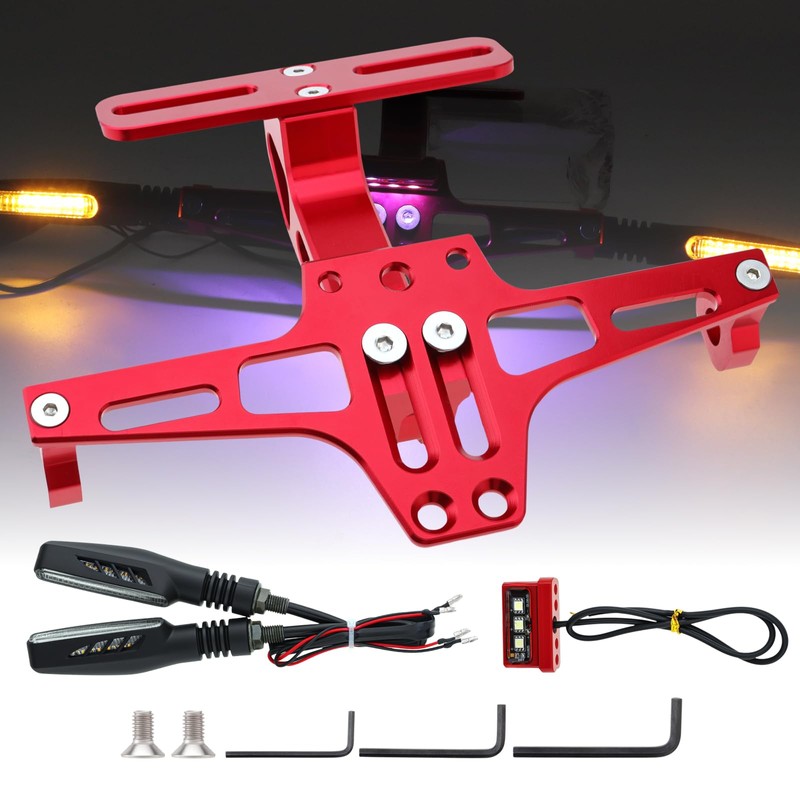 Windance Adjustable Motorcycle License Plate Holder with 2 Indicators Flowing Turn Signal Lights Tidy Holder Fender Eliminator Kit (Red)