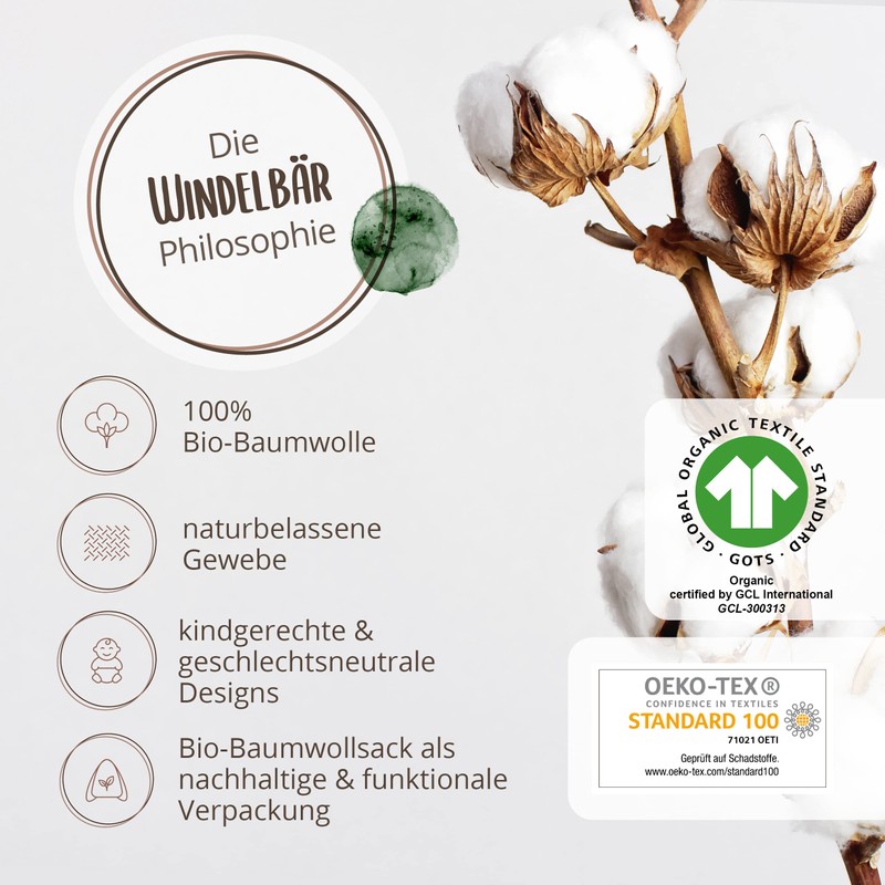 - Natural and safe: the organic cotton for our first equipment for newborns is GOTS and Oeko-Tex certified. We also do not use the process of dyeing with the baby cuddly blankets and only have the natural material printed. "Nappy Bear" stands for sustainability and quality