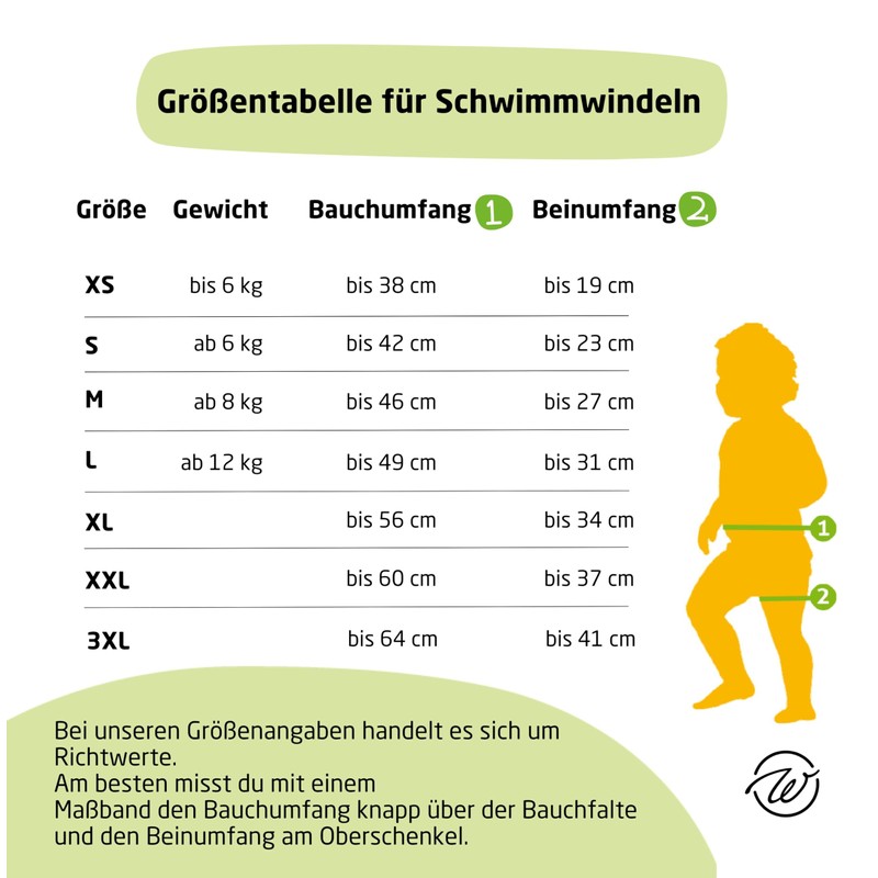 Die Schwimmwindeln der Windelmanufaktur haben eine bequeme Passform. An elastic waistband and well-fitting leg cuffs prevent the swim nappy from leaking. It has no annoying snaps, Velcro, cord or zips that could be dangerous in and around the water.