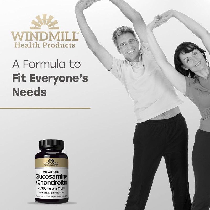 HIGH-POTENCY TRIPLE BLEND. Each daily serving delivers a powerful combination of Glucosamine, Chondroitin, and 2,700mg of MSM. Windmill Natural Vitamins Advanced Glucosamine & Chondroitin is designed for those seeking comprehensive support as part of their daily supplement regimen.
