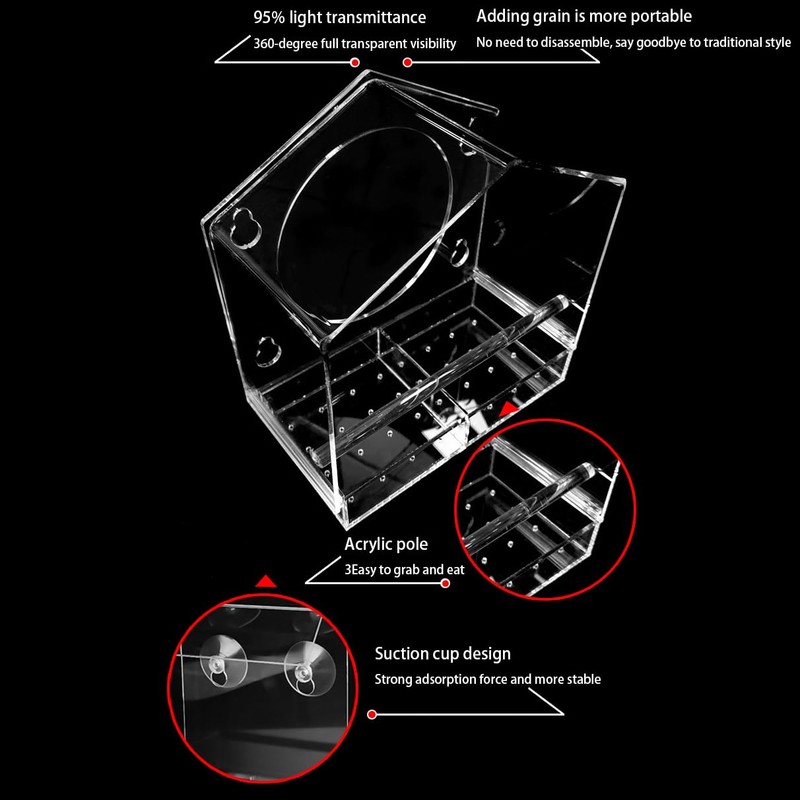 - Comes with a bird stand that is comfortable for birds to grip; the corners are smooth and rounded, which effectively protects birds from injury when they step on it, and the transparent observation is convenient for bird food. When birds eat, they sometimes peck out the food. The splash-proof and leak-proof design of the top cover can avoid waste.