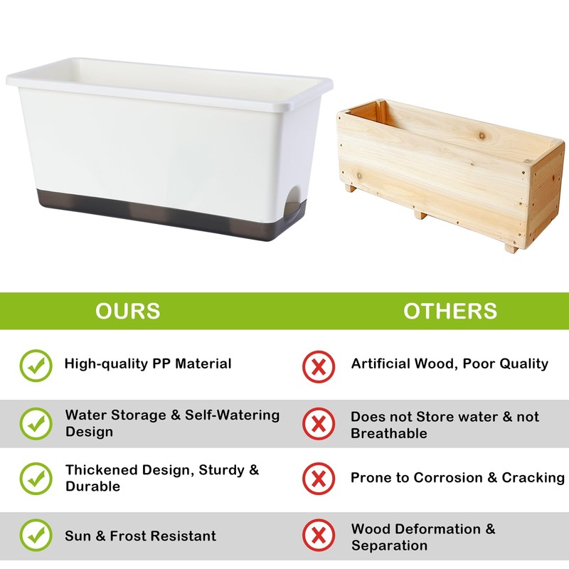 - 【Premium & Durable】The planter pots are made of high quality PP material and has been thickened to bear up to 300KG (660LB). This window box planter is sturdy, wear-resistant and durable. It can be exposed to light, wind, and sunlight for long periods of time, with a lifespan of decades. It is an excellent planter box for both indoor and outdoor.