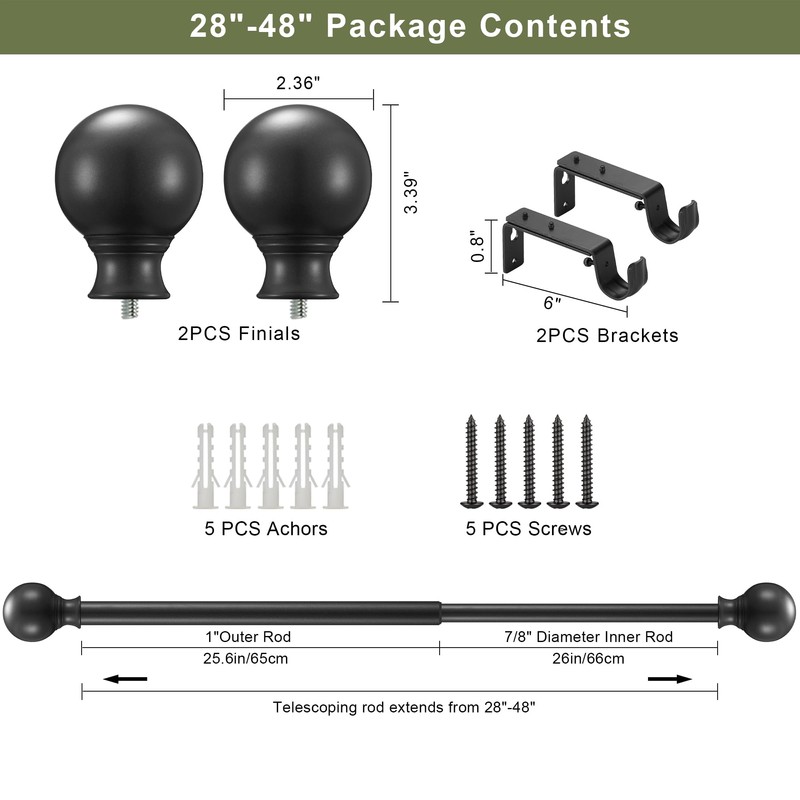 Window Curtain Rods 28 to 48 Inches, 1 Inch Diameter Adjustable Drapery Rod, Decorative Heavy Duty Curtains Rod with Fancy Round Finials for Living Room, Bedroom, Patio, Matte Black