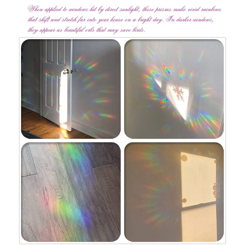 When applied to windows hit by direct sunlight, these prisms make vivid rainbows that shift and stretch far into your house on a bright day. In darker windows, they appear as beautiful orbs that may save birds.