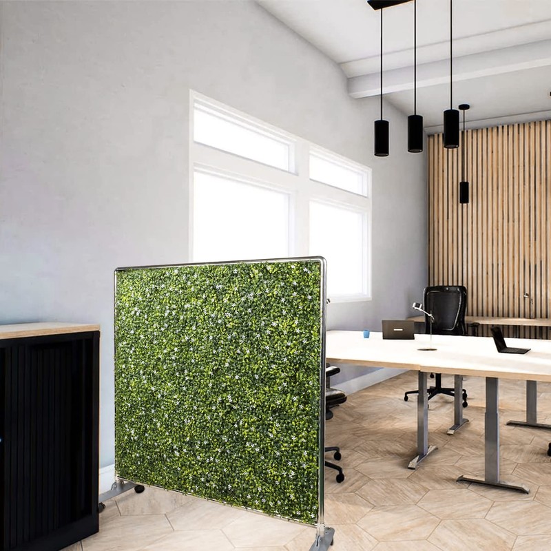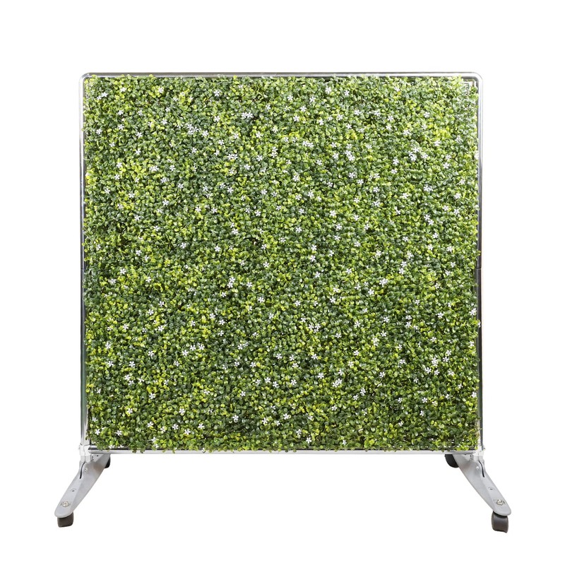 - Our privacy hedge divider come with artificial green grass (boxwood) on both sides. One side of the hedge is decorated with small white flowers and the other side is with all green boxwood.