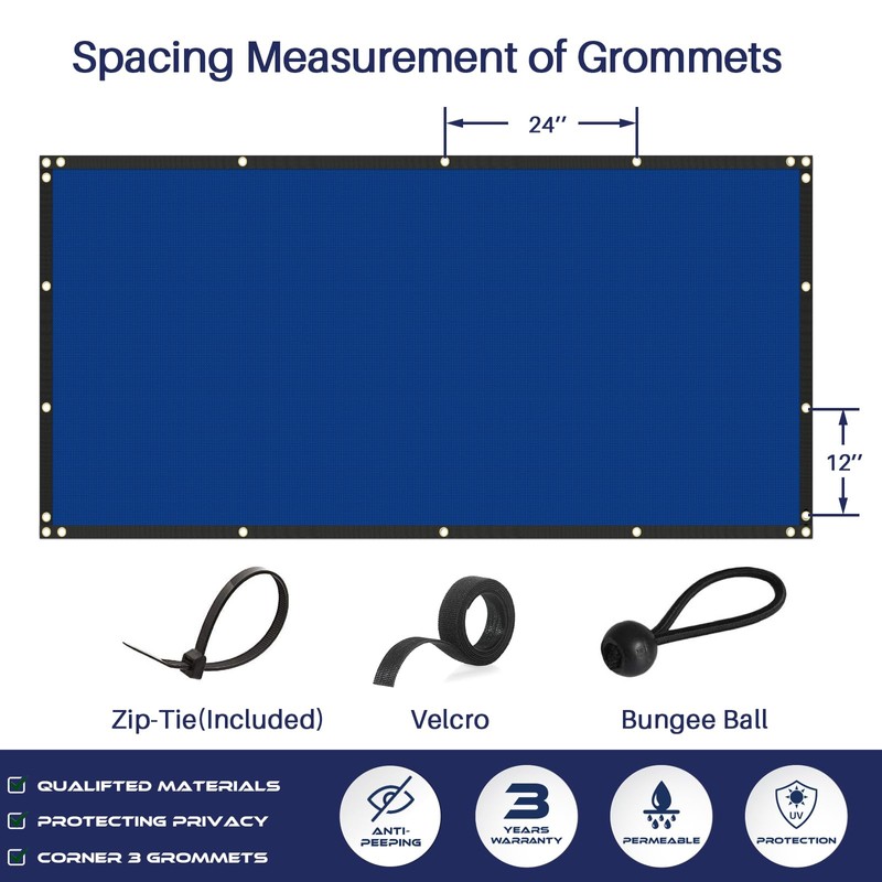 Zip ties included. Easy to install windscreen fence provides the privacy customers need, yet allows air to go through to create breeze. The 2 grommets design on each corner secures position on customer’s deck or fence. The brand new waterproofed polyethylene has 2 grommets on each corner, and side has reinforced seems.