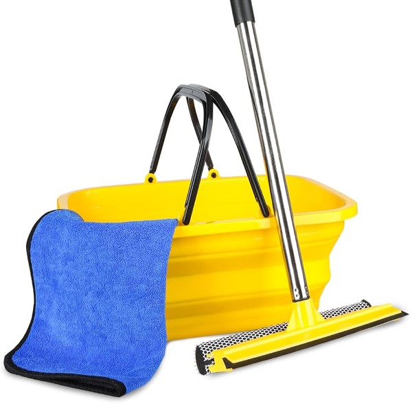 Windshield Car Squeegee and Collapsible Washing Bucket Combo Set, 2 in 1Window Squeegee with Long Handle