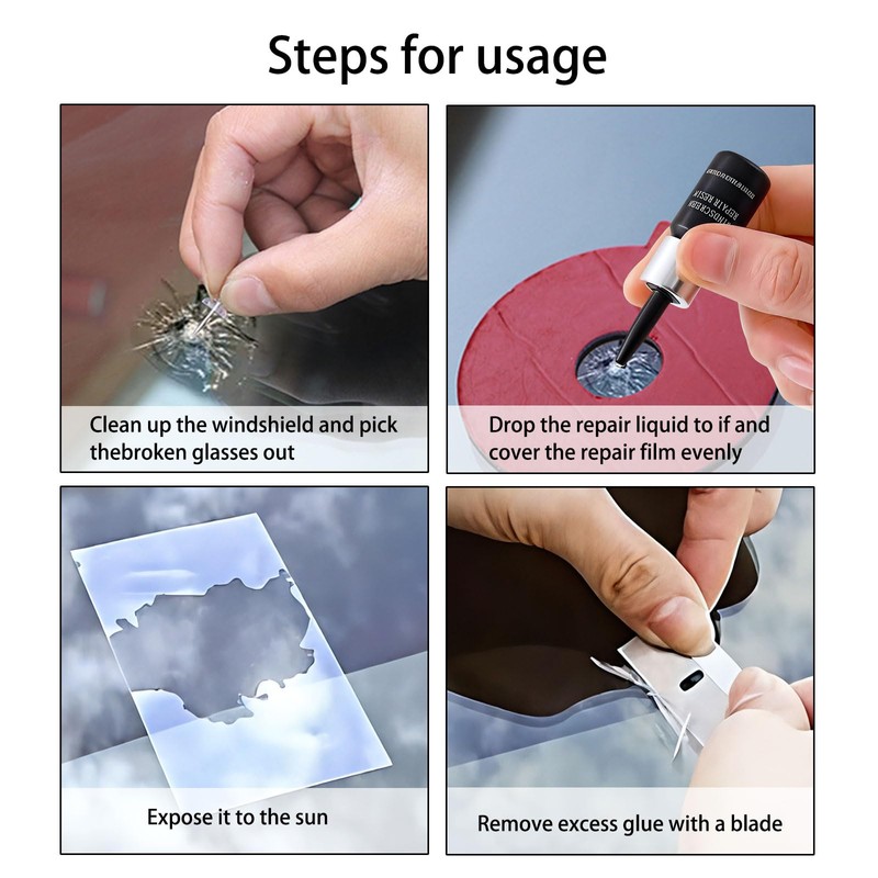 - A complete DIY kit: Windshield repair kit includes everything needed for a successful repair - 1 x 2ml repair resin, 1 x glue injection pad, 1 x syringe, 3 x positioning stickers, 2 x blades, 1 x picks, 5 x curing film, and 1 x instruction manual.
