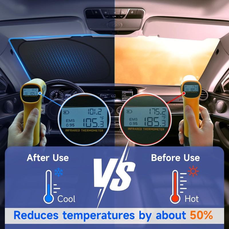 - Protect Your Car Interior: If you park your car outdoors in summer, prolonged exposure to the sun will damage the accessories in your car, making them fade and crack. Our windshield sun shade can block 99.9% of the sun and uv rays, effectively protecting your dashboard, electronic equipment, car seats, etc. from the damage of uv rays.