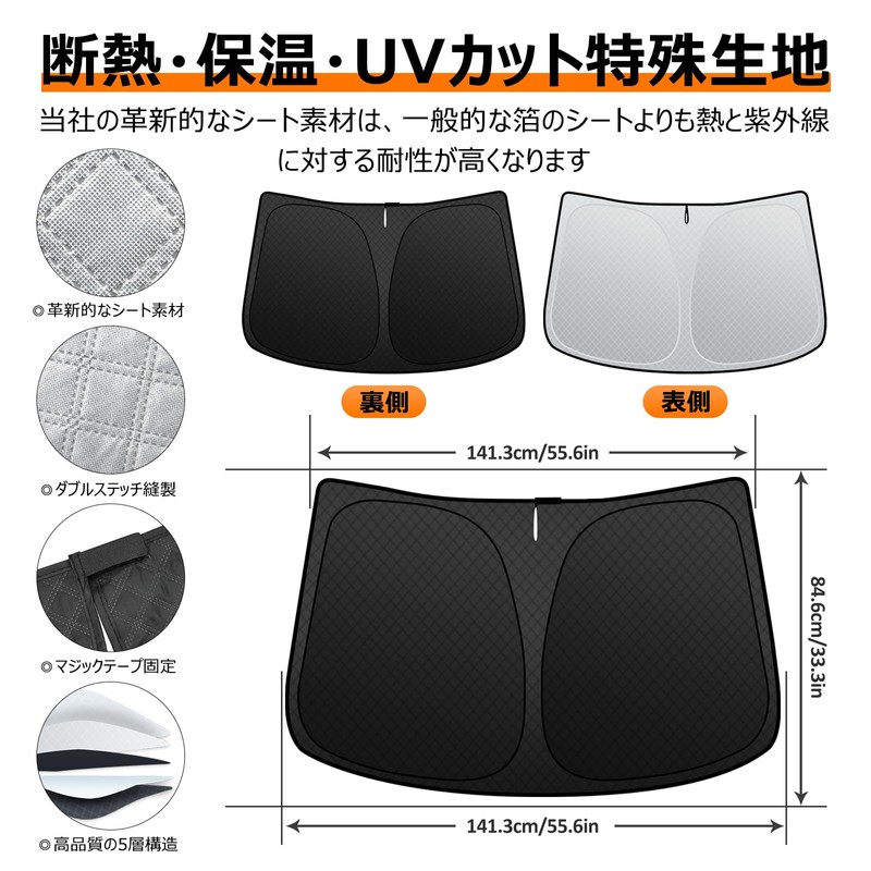 - 5 Layer Reinforced Construction and Next Generation Special Fabric: 1st Layer: High Quality High Density Aluminum Heat Shielding Sheet; 2nd Layer: High Quality High Density Aluminum Heat Shielding Sheet; 3rd Layer: Polyurethane Insulation Material; 4th Layer: High Quality High Density Aluminum Heat Shielding Sheet; 5th Layer: Polyurethane Insulation Material.Sleek, stylish silver surface repels sunshine.Ordinary sunshades are made of thin material with weak light-blocking properties.This product is made of thick silver fabric that provides an increased light shielding rate.Additionally, ordinary sunshades can transfer color to the interior due to friction with the silver surface.