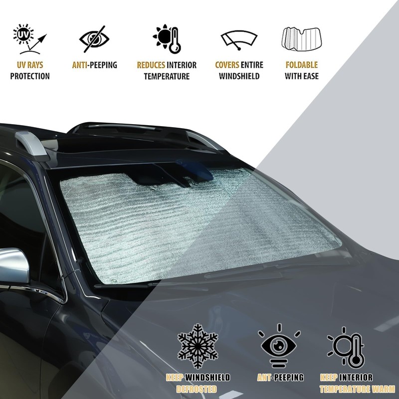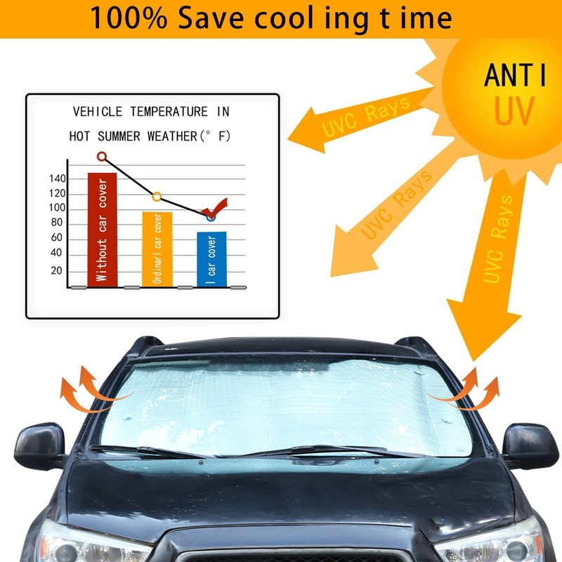 - 🌞[Keep your vehicle cool]: This car sunshade windshield is specially designed for the coolness and comfort of your vehicle interior. The reflective material will block sunlight and heat, which will not only effectively reduce the internal temperature of the car and save the fuel consumption of the air conditioner, but also prevent the center console accessories from fading and cracking.