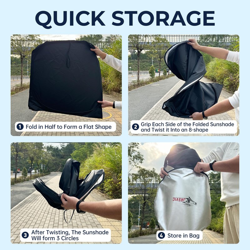 - Compact Packing for Easy Storage: Designed for convenience, JASVIC sun shield easily twists and folds into a compact size, roughly the size of a dinner plate, making parasol para carro a perfect fit for your car’s side door pocket