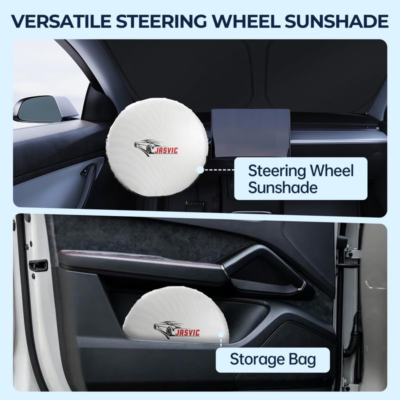 - Versatility Steering Wheel Sunshade: JASVIC windshield sunshade comes with a multifunctional steering wheel cover, which not only helps keep your steering wheel cool by blocking sunlight from side windows but also doubles as a compact storage