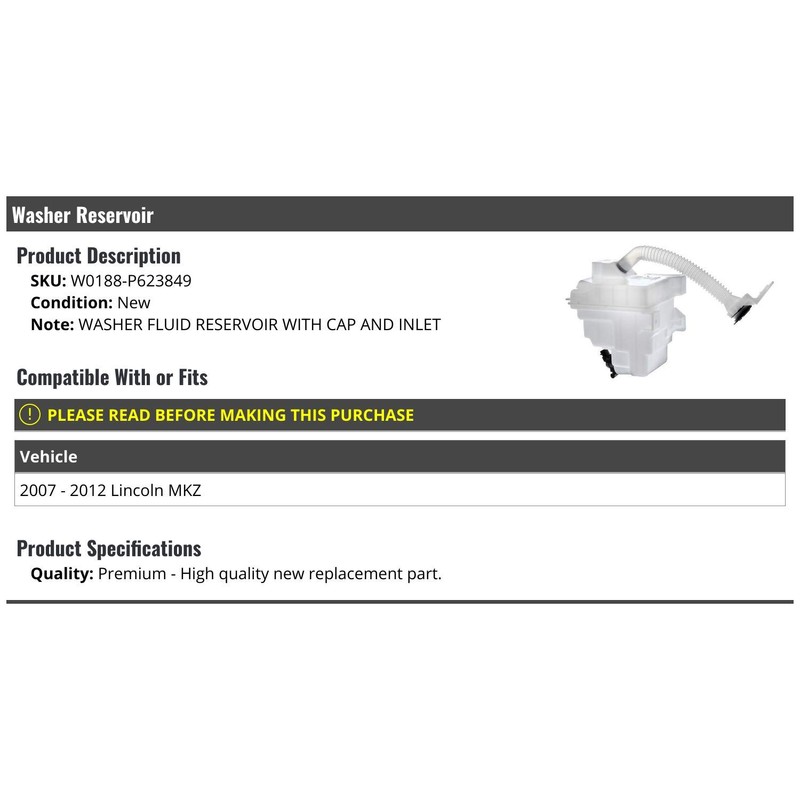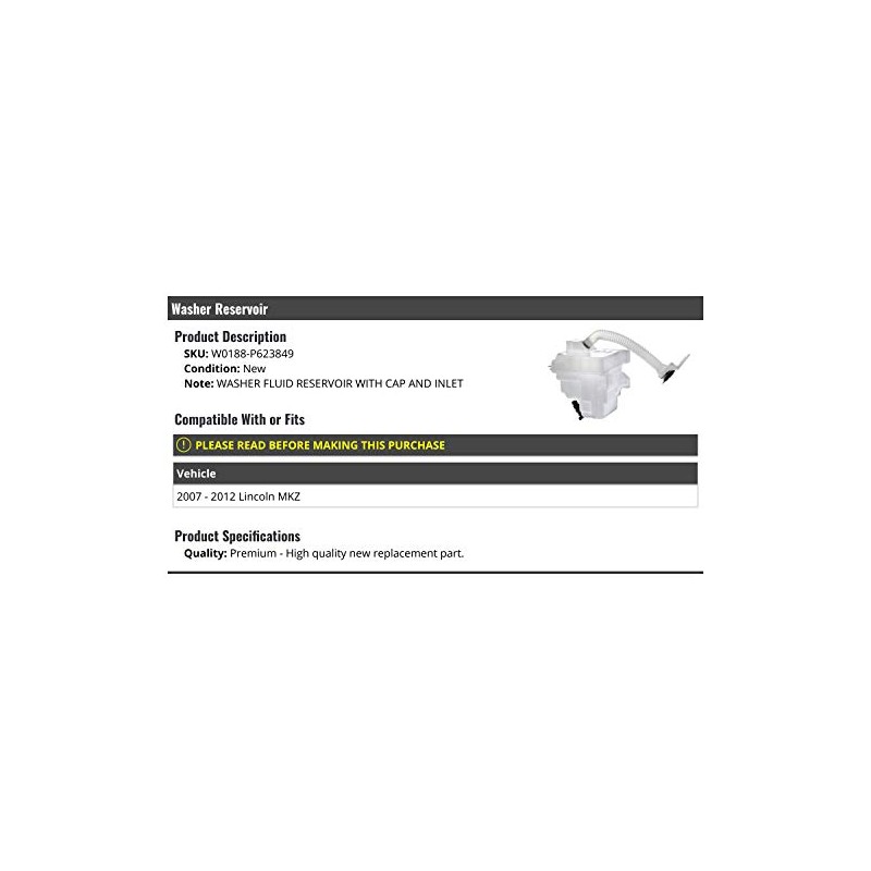 Windshield Washer Fluid Reservoir Tank - with Cap and Inlet - Compatible with 2007-2012 Lincoln MKZ