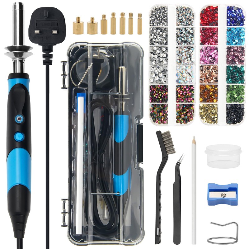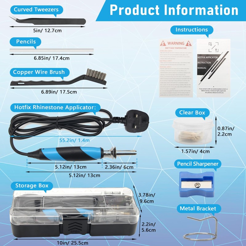 - ❤【Rich Accessories】--Package includes 1 hot fix rhinestone setter, 1 instruction manual, 1 storage box, 1 pencil, 1 pencil sharpener, 1 metal holder, 1 copper wire brush, 1 curved tweezers, 7 hotfix tips (2/3/4/5/7/9mm & Hot Spot), 2 boxes of rhinestones. Amazing kit to meet multiple DIY needs with no additional purchase.