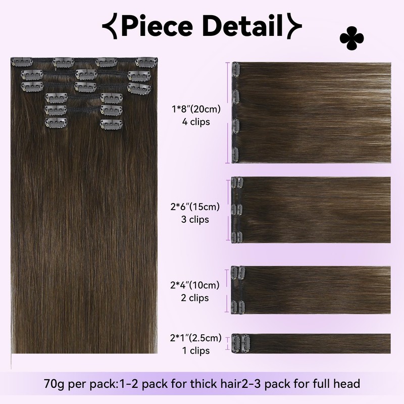 - 【Clip in Hair Extensions Human Hair Specification】-- Brown hair extensions for women real human hair, 7pcs 70g with 16 clips per set, 20 Inch, #4 Medium Brown. ❤️According to your own hair volume, just to thicker your hair, advice buy 1-2 sets; want to full head, advice buy 2-3 sets. When the weight is the same, the longer size will be thinner than the shorter size a feeling of.