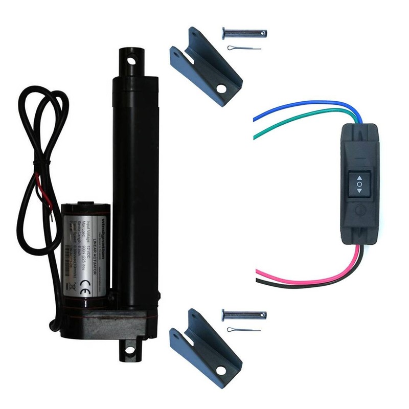 • Includes 1pc 12 volt linear actuator (select stroke length), 1pc DPDT up/down switch, and 2pcs steel mounting brackets with fasteners.
