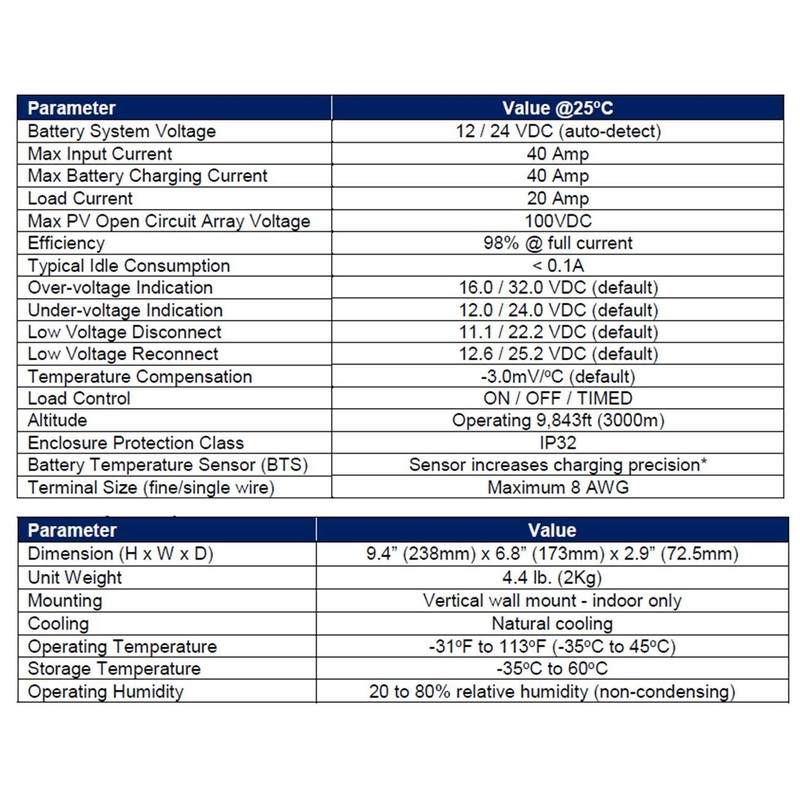 - LCD Screen and LED's provide all system information (amps, volts, solar voltage, temperature, load control, etc). Included battery temperature sensor helps extend battery life.