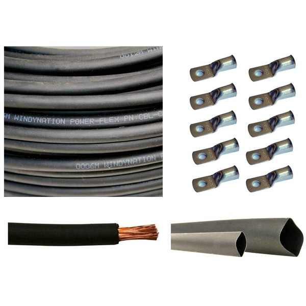WindyNation WNI 2/0 AWG 2/0 Gauge 20 Feet Black Battery Welding Pure Copper Ultra Flexible Cable + 5pcs of 5/16" & 5pcs 3/8" Copper Cable Lug Terminal Connectors + 3 Feet Heat Shrink Tubing