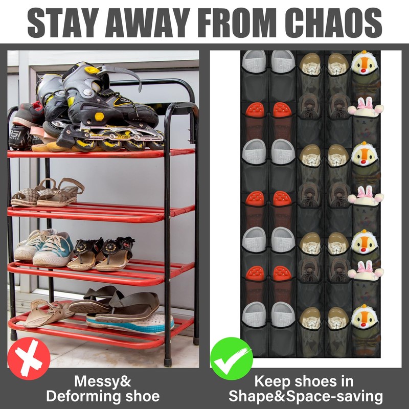 - Proper Size: the hanging over the door shoe organizer measures approx. 76.4 x 26.4 inches (H x W), fits most standard doors, closets, can be placed in utility rooms, bathrooms, garages, can store shoes, clothes, hats, gloves, socks, handmade items, pantry, beauty products or household cleaning supplies