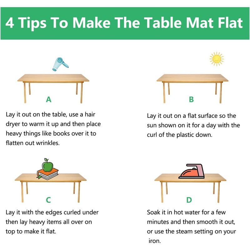 • ☑️【QUALITY ASSURANCE & TIPS】100% Satisfaction Guarantee. CONTACT US FIRST if you are not satisfied with our table protector for any reason, REFUND OR REPLACE AVAILABLE. As the new clear table pads are rolled packed, so the table mats will be a little wrinkled and warped edge. The solution is : A. Heating it with a hair dryer to make it flat; B. Lay it in the sun for half an hour; C. Lay out in reverse-roll direction and put something heavy on top of it; D. Use your iron on the curled places.