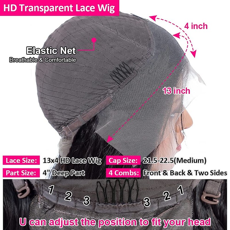 - HD Lace Frontal Wig Cap Size:HD Transparent Lace Wig, Melt Prefectly with ALL Skin Tone,13x4inch 220% Density ,Long Parting Space in Front, 22.5inch Medium Size Cap and with a Adjustable Straps and 4 Combs,More Comfortable To Wear.