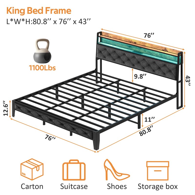 Winkalon King Size Bed Frame, Storage Headboard with Charging Station,Platform Bed Frame with RGB Lights,Solid and Stable, Noise Free, No Box Spring Needed, Easy Assembly,Gray