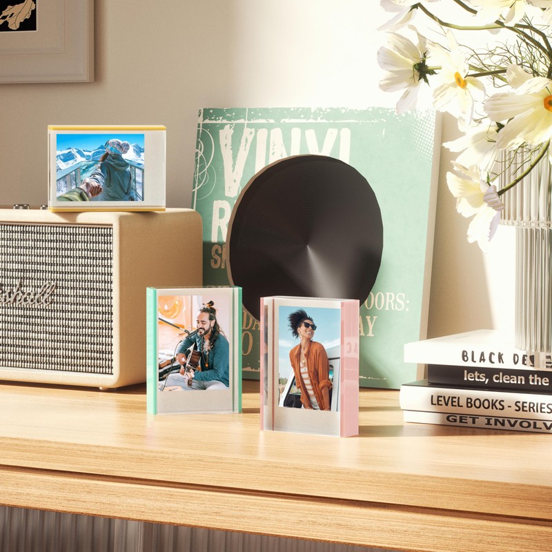 - Instax Frame: Polaroid film frames are made of high quality Acrylic, consists of a transparent acrylic block and a white U-shaped back panel, the Fujifilm is in the middle of both; High durability makes it shatterproof, safe around children