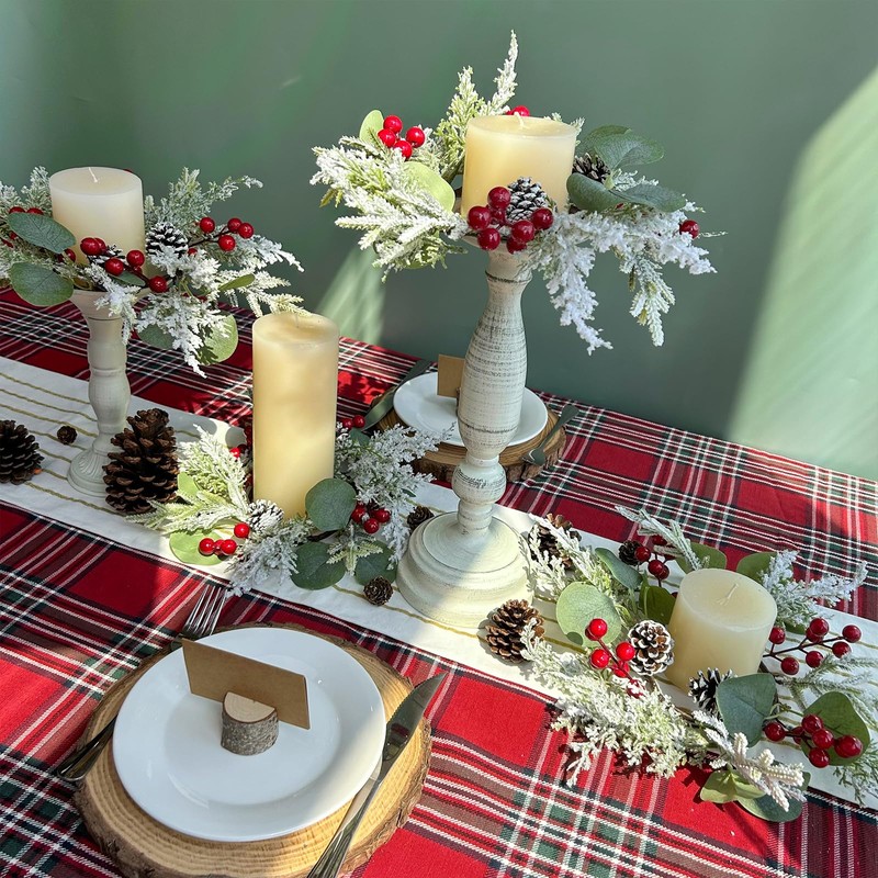 - Quantity: 4 Pcs Artificial Eucalyptus and Snowy Cedar Candle Rings Christmas Candle Holder Rings Mini Window Wreaths with Red Berries Pine Cones. Each Christmas candle ring consists of eucalyptus leaves, snowy cedar twigs, 4 clusters of red berries and 3 pcs small pine cones, providing a simple yet powerful addition to your winter decor. They are versatile to meet your daily needs and various holiday decorating needs.