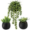 - Quantity: This package includes three assorted artificial plants: a faux Aloe plant, a faux String of Pearls plant, and a lifelike Donkey Tail plant. Each succulent plant is housed in a round black planter with natural pebbles to keep the plant in place, creating a modern and elegant look that complements a variety of interior styles.