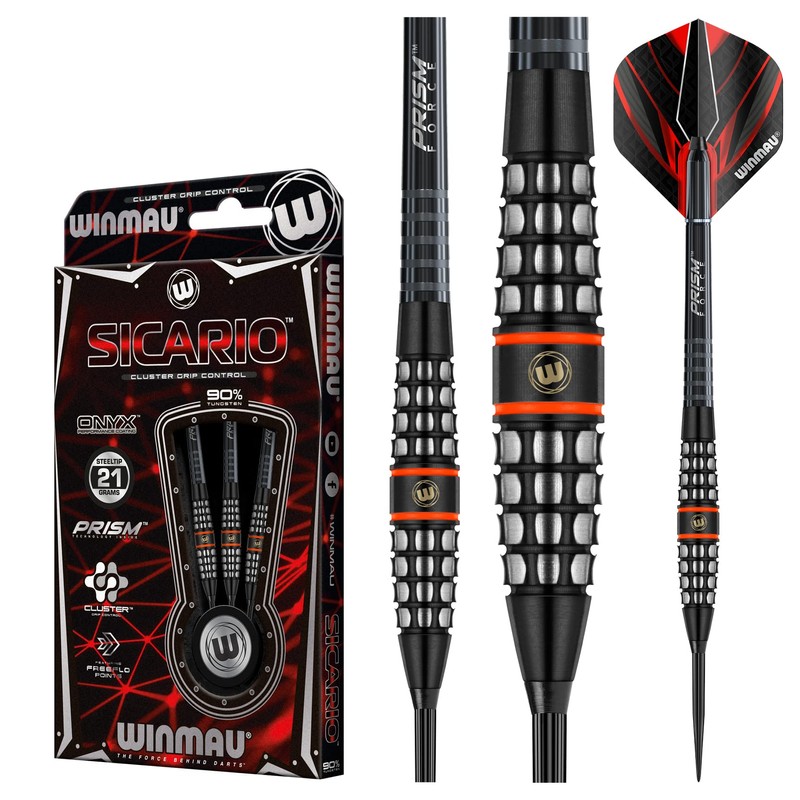 - Our latest and greatest design of choice for serious players. Sicario features cutting-edge unique mini-scallop cluster grip technology, giving your fingers the sweetest feel ever and electric control, making these darts our most connected design. Finished with a co-ordinated tri-colour scheme these striking darts combine style, innovation and ultra-modern performance all together.