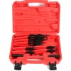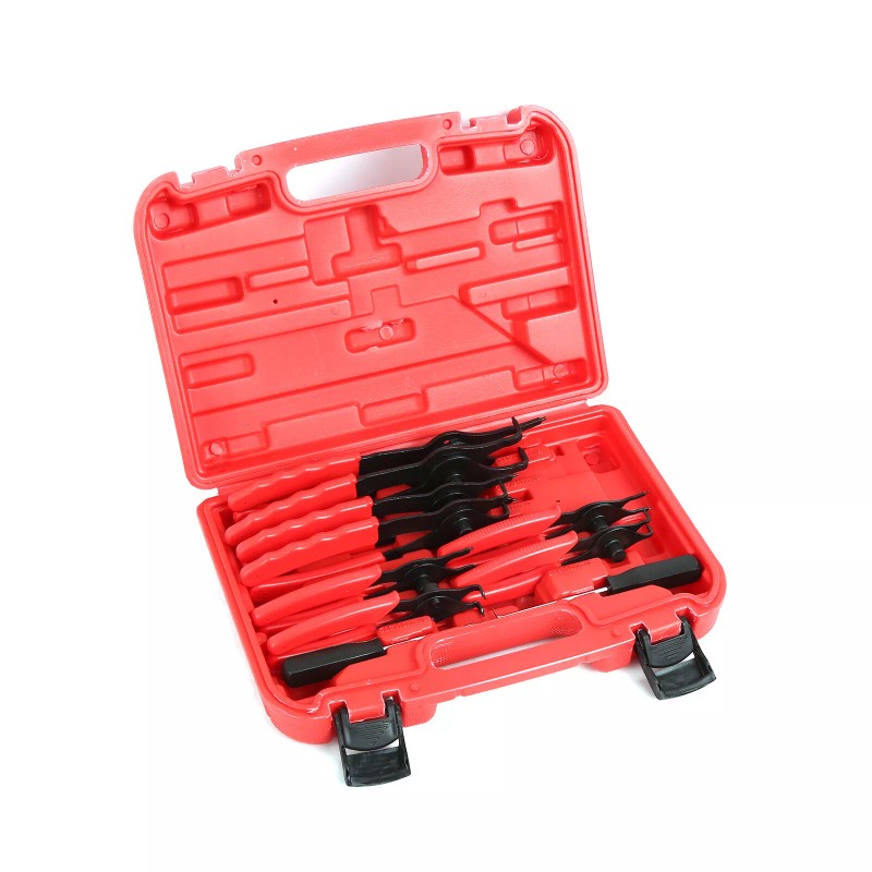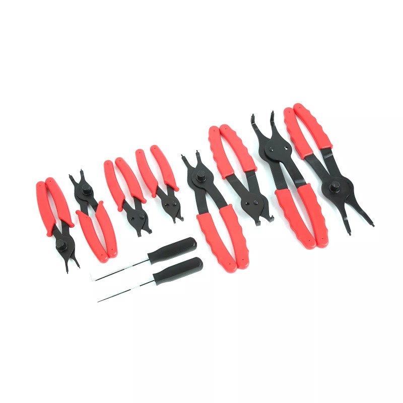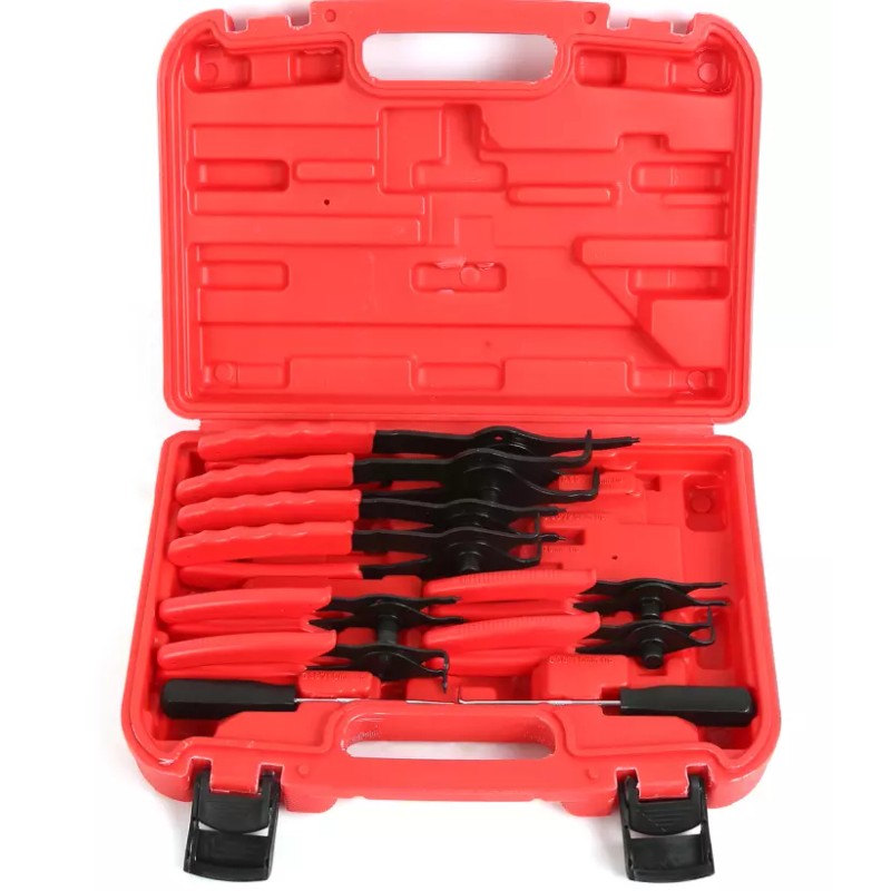 REMOVE CONNECTION CLIPS: Use the Snap Ring Plier Set to remove snap ring (circlip) retaining rings on your lawn mower, tractor, shredder, farm equipment, truck, car, SUV, or other vehicle while performing brake pad removal and routine maintenance; Reversible joints and adjustable jaw precision screw bit allow for 2 types of function on both internal and external retaining rings; Use included hook and pick tools to clean out gunk, get into hard-to-reach areas, and properly grip dropped clips GRIP COMFORTABLY: Approximate 3.5-inch to 4-inch (8.9cm to 10.2cm) long vinyl/plastic mixed insulated handles on C clip pliers for a comfortable non-slip grip and ensures less user fatigue and more productivity BUILT TO LAST: Circlip pliers constructed from heat-treated steel that is perfect for home and garage use and offers maximum strength and longevity that resists rust and corrosion EASY STORAGE: Snap pliers come packed inside a heavy-duty 12.5” x 3.2” x 9.4” inch (31.8cm x 8.1cm x 23.9cm) plastic blow-molded carrying case with handle for easy transportation, safe storage, and quick organization PACKAGE CONTENTS: Package includes (8) c ring pliers (4 bent tip pliers – 5.5-inch with 0.038-inch/1mm tips, 5.5-inch with 0.047-inch/1.2mm tips, 7.5-inch with 0.070-inch/1.8mm tips, 8.5-inch with 0.090-inch/2.3mm tips; 4 straight tip pliers – 6-inch with 0.038-inch/1mm tips, 6-inch with 0.047-inch/1.2mm tips, 8-inch with 0.070-inch/1.8mm tips, 9-inch with 0.090-inch/2.3mm tips) + (1) 5-inch hook + (1) 5-inch pick + (1) carrying case Snap Ring Pliers Kit Contents C Clip Pliers, 8 Piece 5.5-inch with 0.038-inch (1mm) Bent Tip Pliers 5.5-inch with 0.047-inch (1.2mm) Bent Tip Pliers 6-inch with 0.038-inch (1mm) Straight Tip Pliers 6-inch with 0.047-inch (1.2mm) Straight Tip Pliers 7.5-inch with 0.070-inch (1.8mm) Bent Tip Pliers 7.5-inch with 0.070-inch (1.8mm) Bent Tip Pliers 8-inch with 0.070-inch (1.8mm) Straight Tip Pliers 9-inch with 0.090-inch (2.3mm) Straight Tip Pliers 5" inch Hook and Pick Clean out gunk, hard-to-reach areas, and properly grip dropped clips |