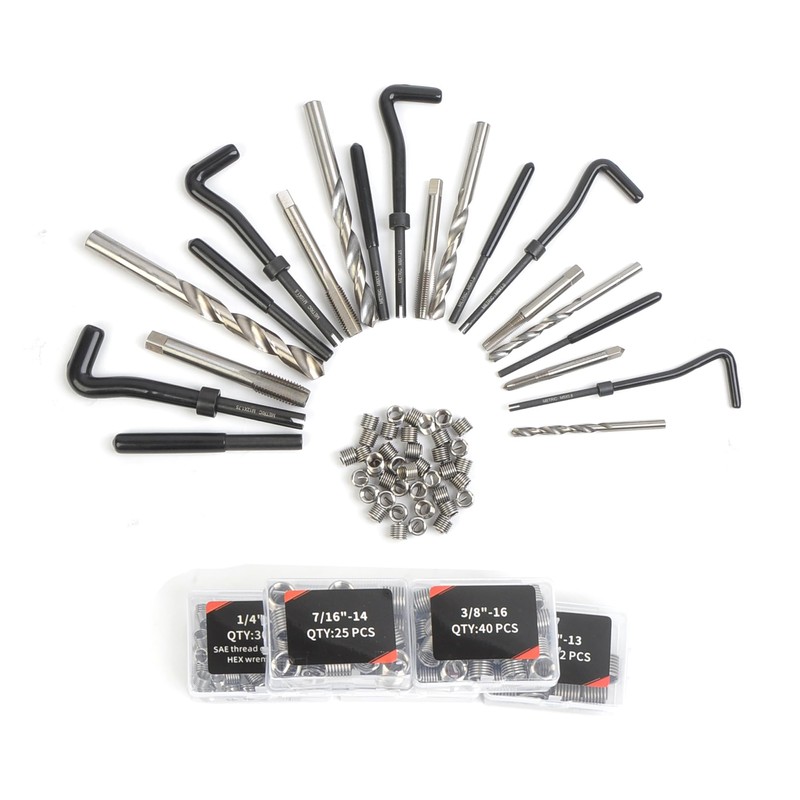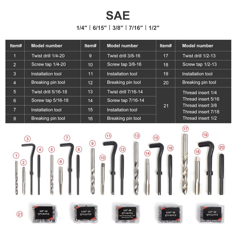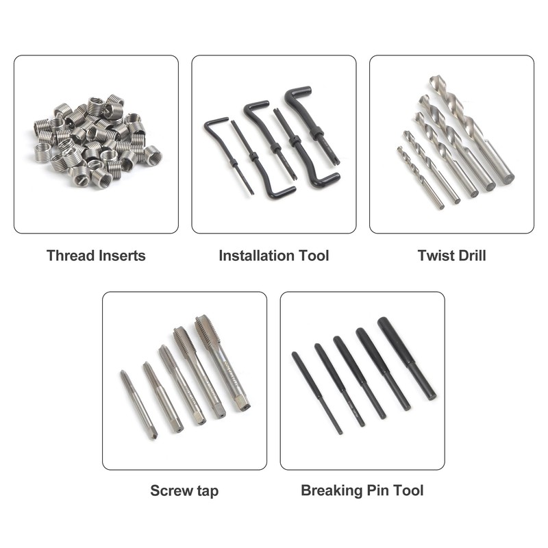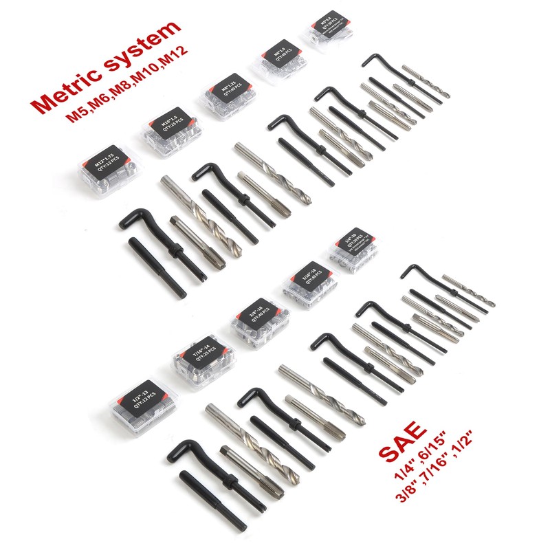 • Complete Thread Repair Kit Include: 110x Wire Thread Inserts M5 x 0.8 x 6.7mm / M6 x 1.0 x 8.0mm / M8 x 1.25 x 10.8mm / M10 x 1.5 x 13.5mm / M12 x 1.75 x 16.3mm; 110x Wire Thread Inserts 1/4"-20 / 5/16"-18 / 3/8"-16 / 7/16"-14 / 1/2"-13
