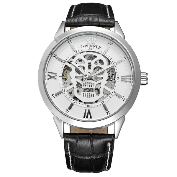 Winner Men Casual Simple Hollow Dial PU Strap Mechanical Movement Watch Wristwatch (F)
